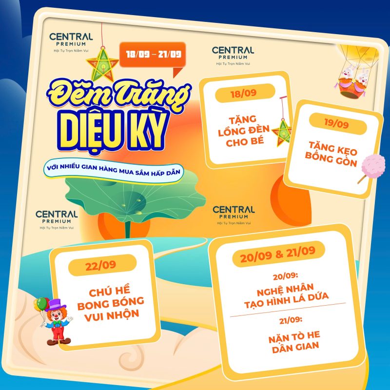 Từ ngày 18/09 – 22/09, TTTM Central Premium chào đón mùa trăng rộn ràng, với vô vàn gian hàng ưu đãi “không thể bỏ lỡ” và các hoạt động Trung Thu hấp dẫn dành cho cả gia đình.